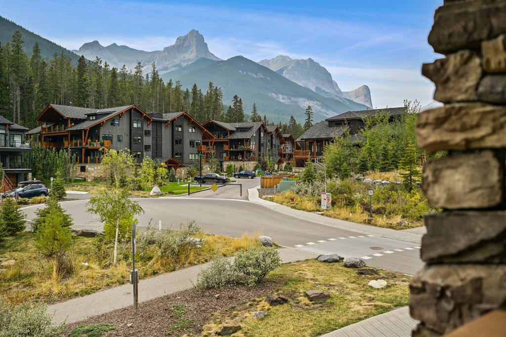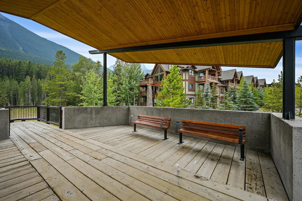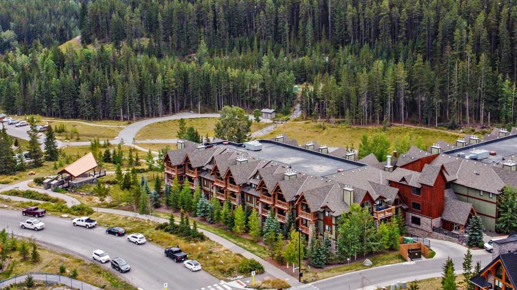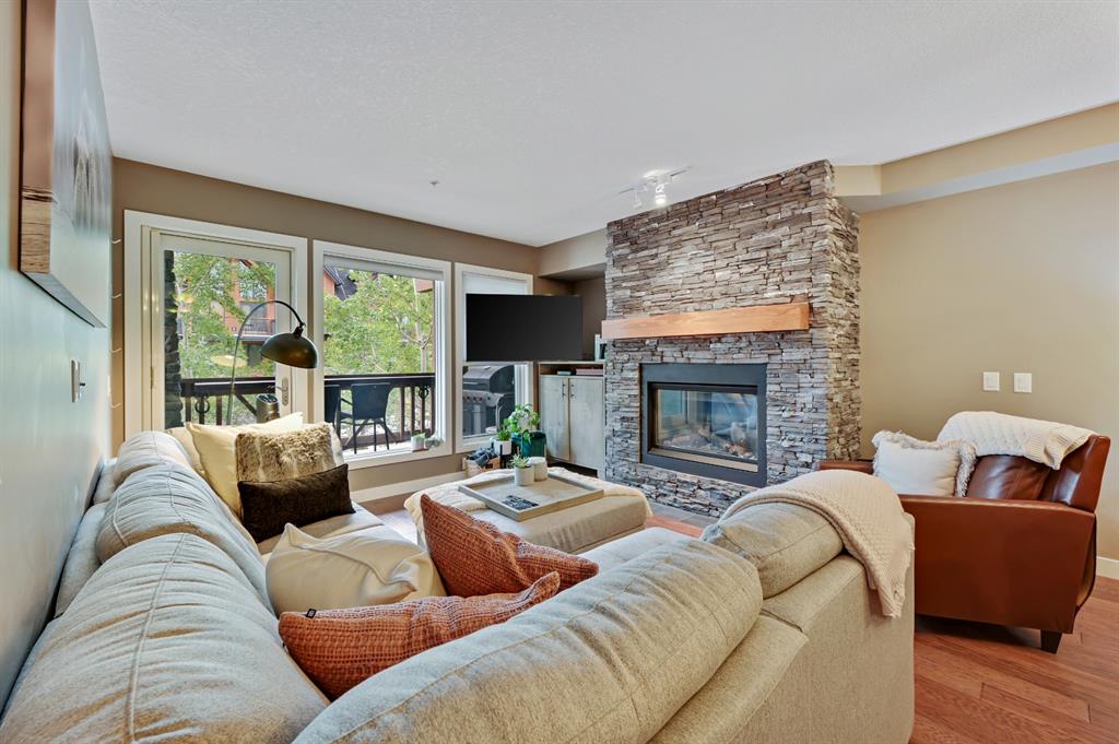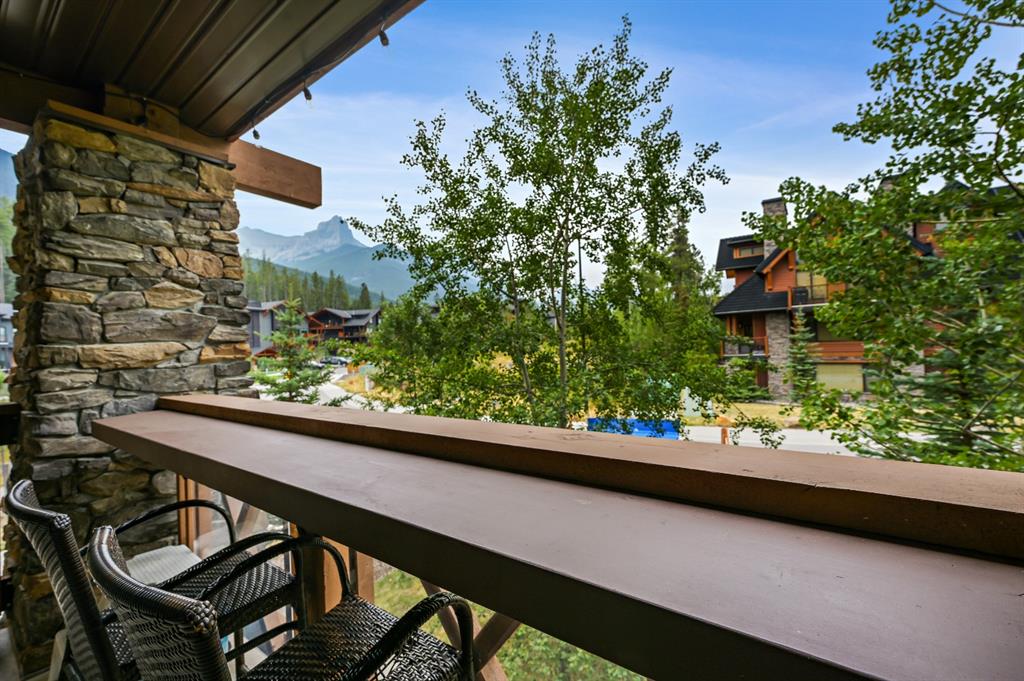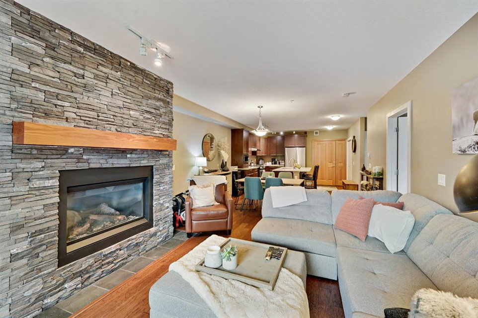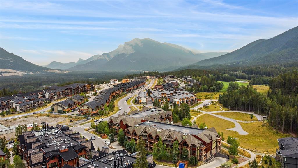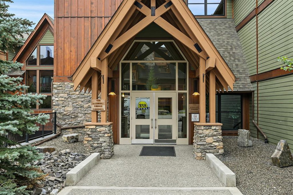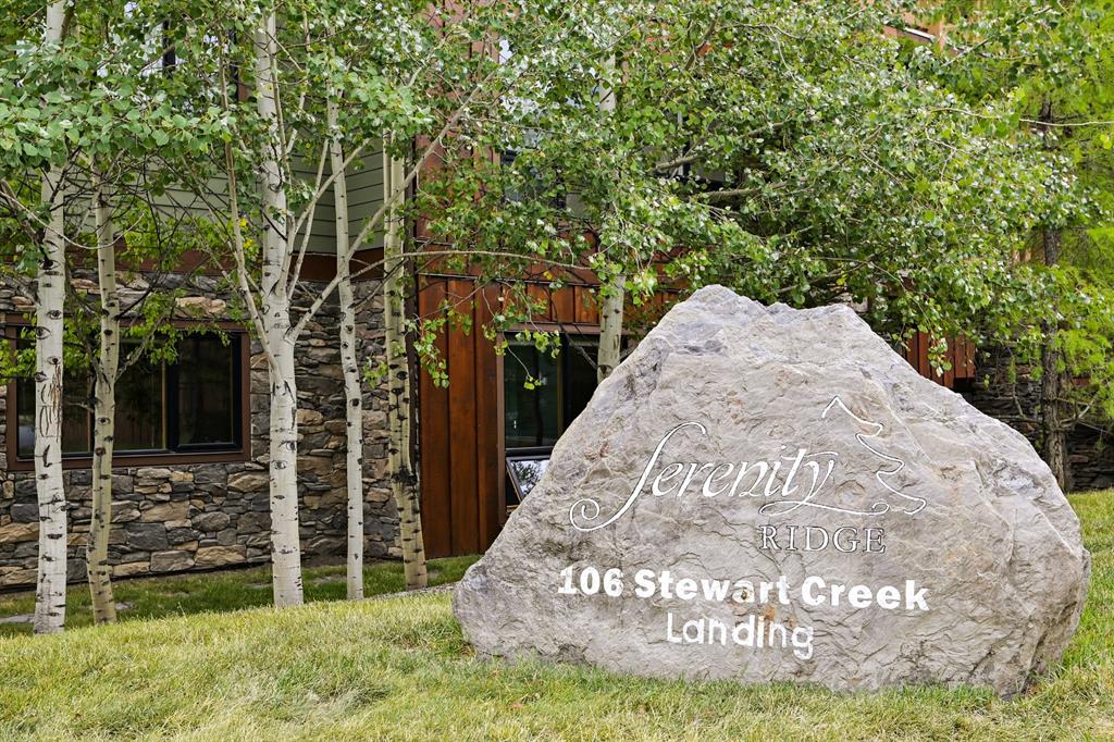 Here’s the one you have been waiting for! Spacious open concept condo in desirable Serenity Ridge with TWO balconies and stunning 180 degree mountain views! As you enter you will notice the gleaming hardwood flooring and the high quality of workmanship and attention to detail. Chef’s dream kitchen with espresso stained cabinetry, granite counters, upgraded stainless steel appliances, tile backsplash, and large center island with undermount sink. Open to the dining room and living room with wall to wall windows and gorgeous floor to ceiling rundle stone gas fireplace with cedar mantle. Garden door out to the large main balcony with bar ledge. Master suite with walk-in closet and full ensuite bathroom with tile flooring and 10mm glass walk in shower. Second private balcony off the master suite overlooking the forest and mountains, great spot to enjoy your morning coffee! Additional Den/2nd Bedroom with another adjoining full 4-piece bathroom and insuite laundry. All this plus convenient heated underground parking and separate storage locker! Unwind in the hot tub area or chill with friends at the outdoor firepit after an awesome day of hiking, golfing or skiing. Prime location steps from Stewart Creek Golf Club, and surrounded by parks, greenspaces, frisbee golf course, sports field, and endless pathways and mountain trails. Come enjoy all that this 3 Sisters Mountain Village community has to offer!