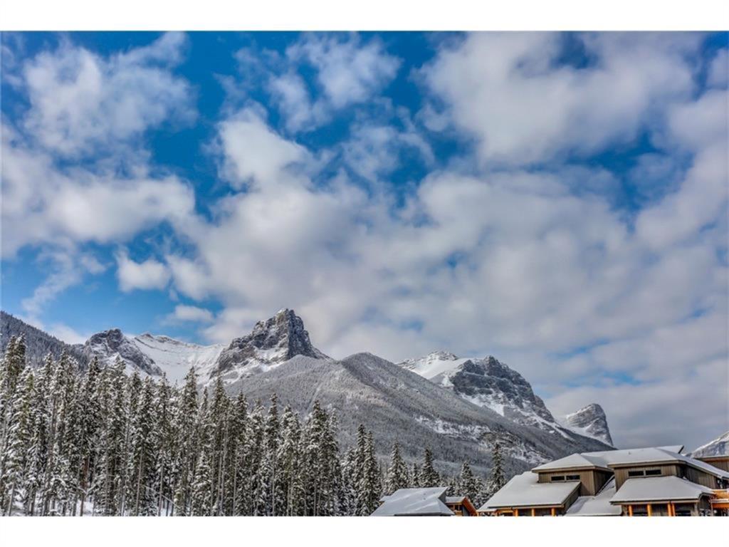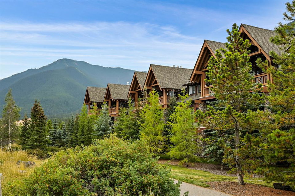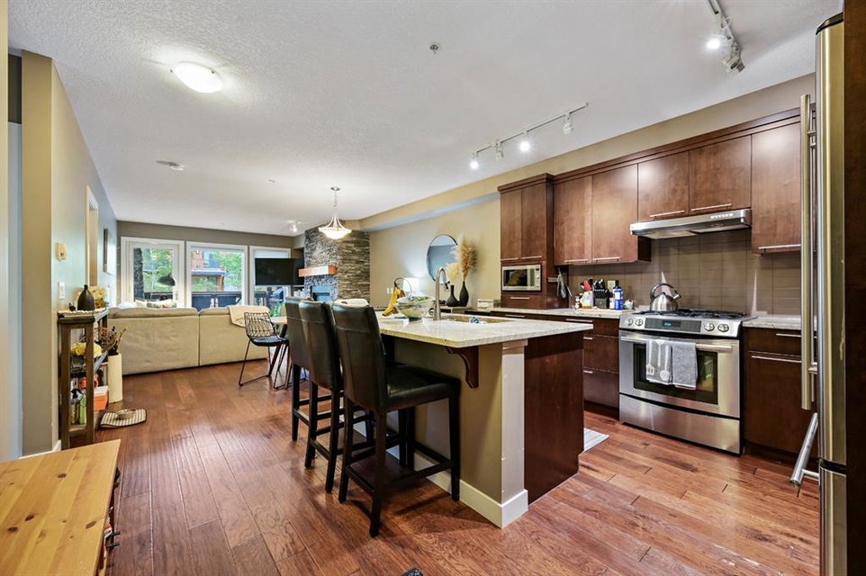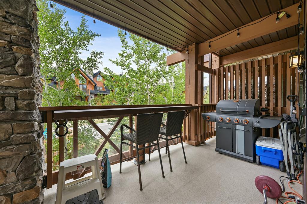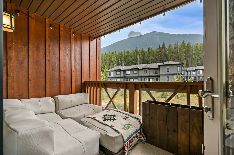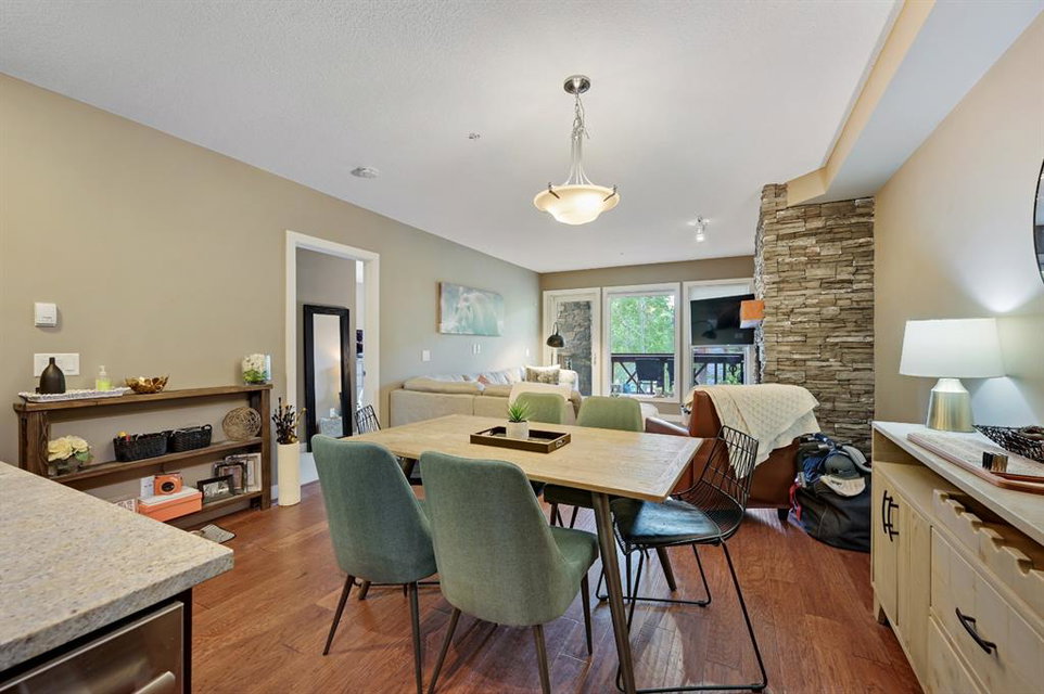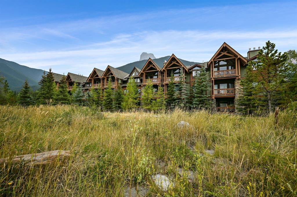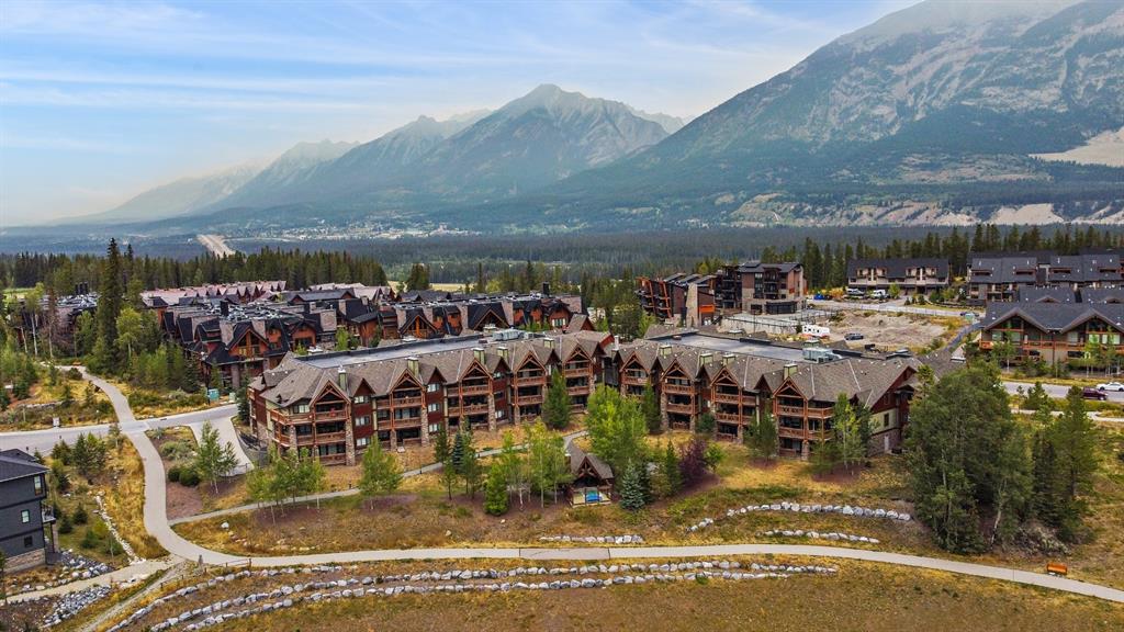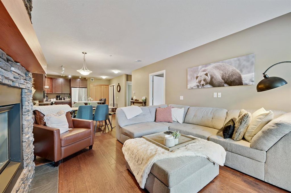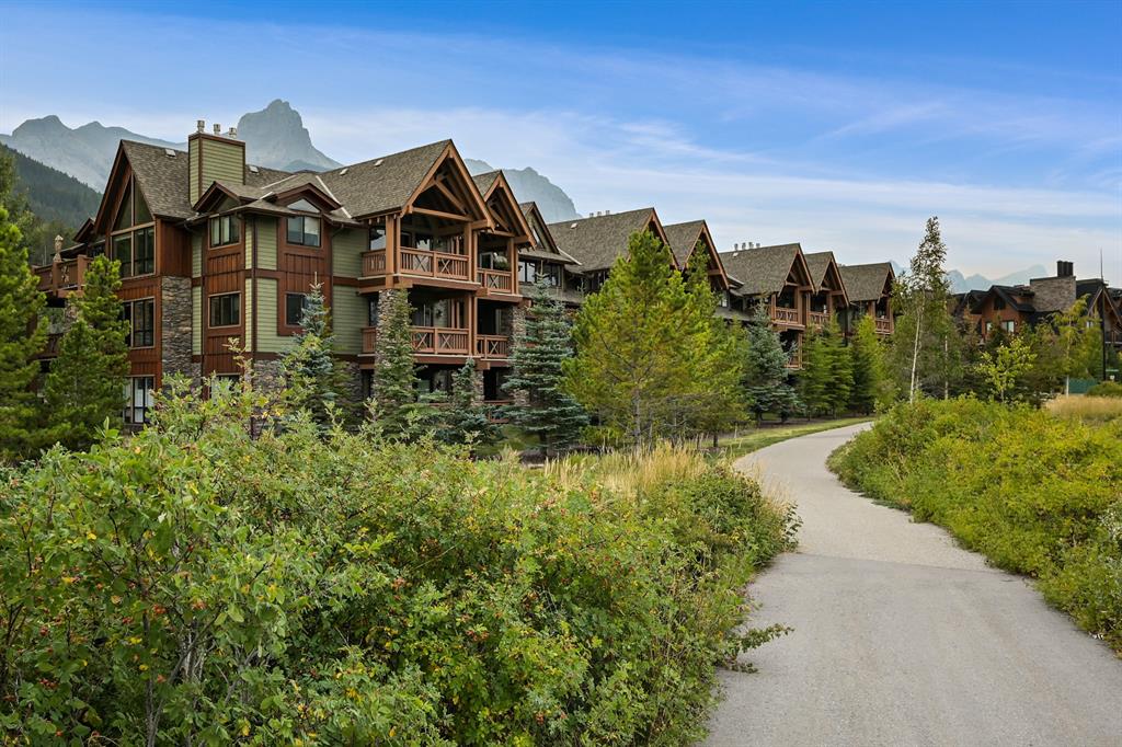 Here’s the one you have been waiting for! Spacious open concept condo in desirable Serenity Ridge with TWO balconies and stunning 180 degree mountain views! As you enter you will notice the gleaming hardwood flooring and the high quality of workmanship and attention to detail. Chef’s dream kitchen with espresso stained cabinetry, granite counters, upgraded stainless steel appliances, tile backsplash, and large center island with undermount sink. Open to the dining room and living room with wall to wall windows and gorgeous floor to ceiling rundle stone gas fireplace with cedar mantle. Garden door out to the large main balcony with bar ledge. Master suite with walk-in closet and full ensuite bathroom with tile flooring and 10mm glass walk in shower. Second private balcony off the master suite overlooking the forest and mountains, great spot to enjoy your morning coffee! Additional Den/2nd Bedroom with another adjoining full 4-piece bathroom and insuite laundry. All this plus convenient heated underground parking and separate storage locker! Unwind in the hot tub area or chill with friends at the outdoor firepit after an awesome day of hiking, golfing or skiing. Prime location steps from Stewart Creek Golf Club, and surrounded by parks, greenspaces, frisbee golf course, sports field, and endless pathways and mountain trails. Come enjoy all that this 3 Sisters Mountain Village community has to offer!