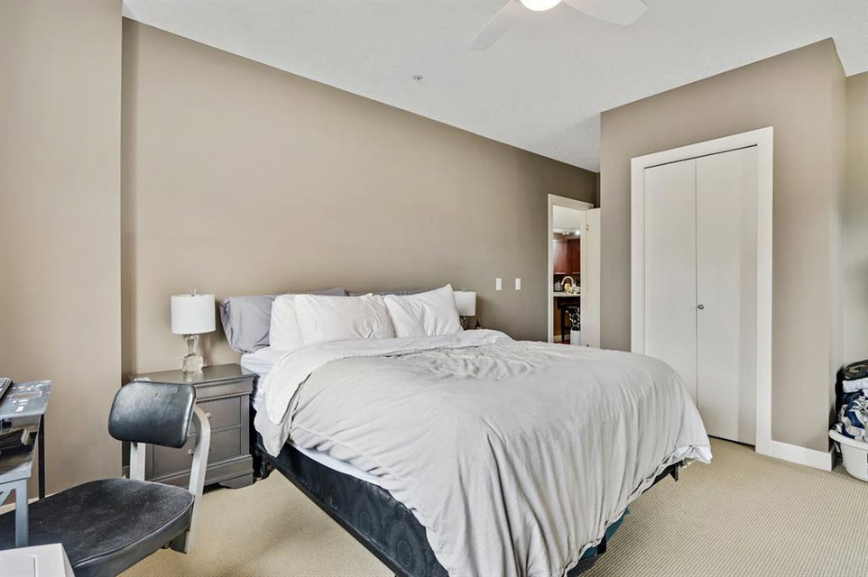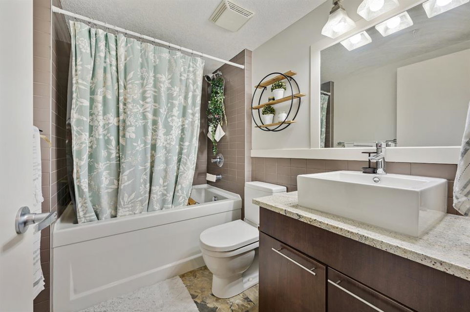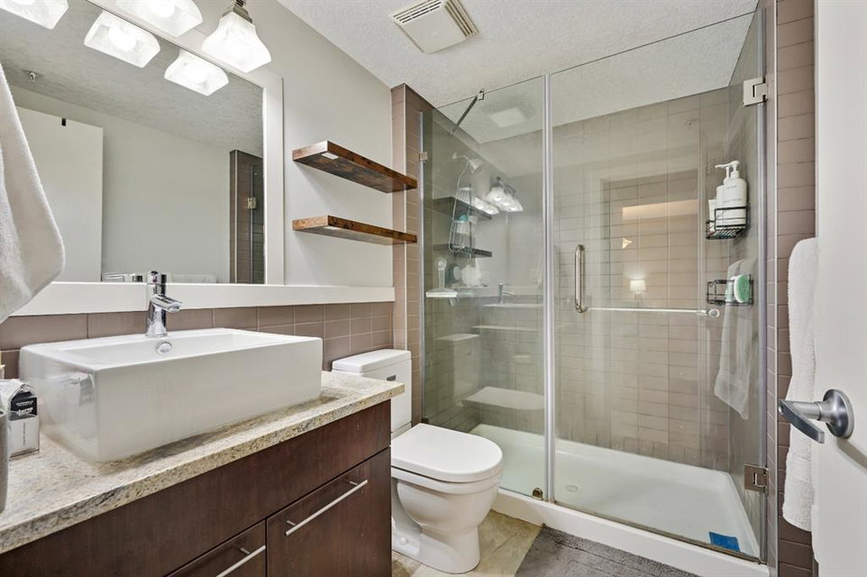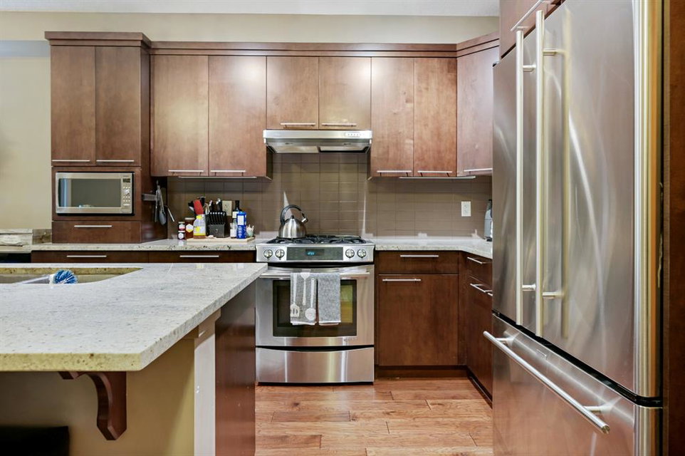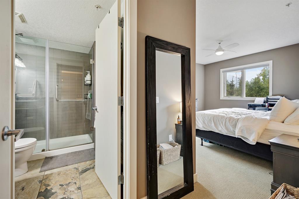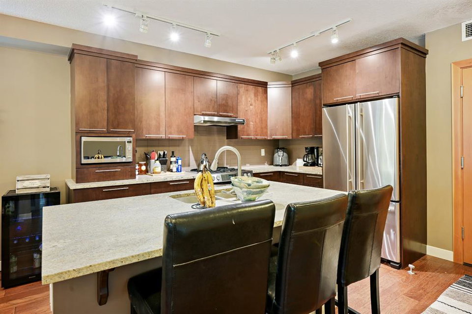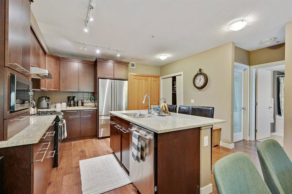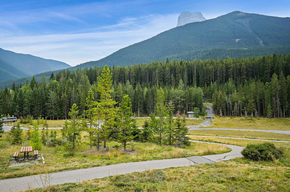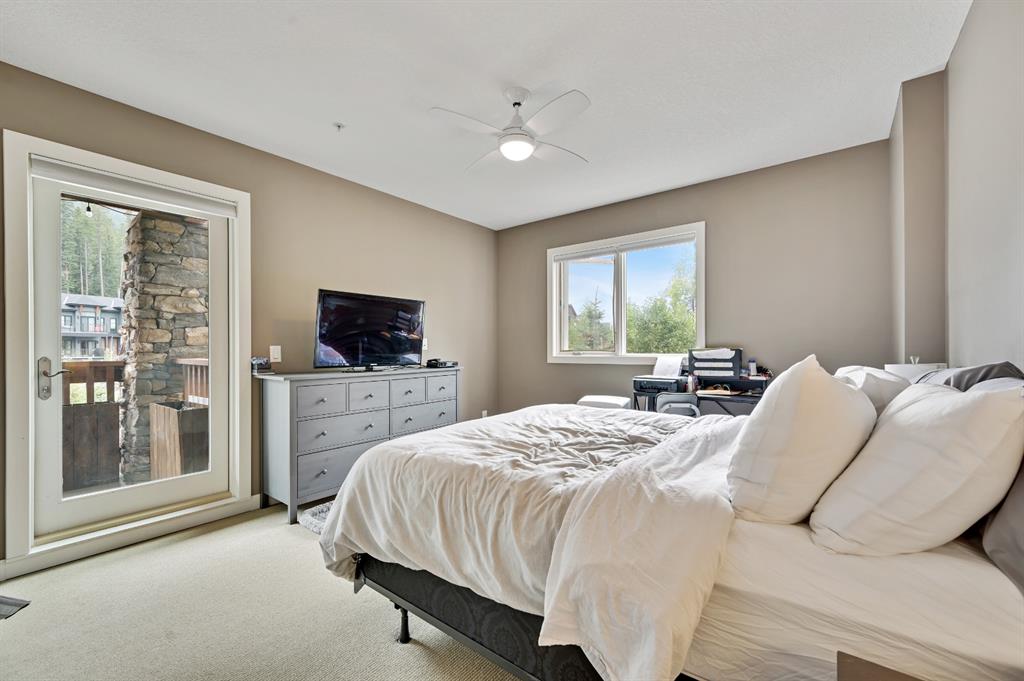 Here’s the one you have been waiting for! Spacious open concept condo in desirable Serenity Ridge with TWO balconies and stunning 180 degree mountain views! As you enter you will notice the gleaming hardwood flooring and the high quality of workmanship and attention to detail. Chef’s dream kitchen with espresso stained cabinetry, granite counters, upgraded stainless steel appliances, tile backsplash, and large center island with undermount sink. Open to the dining room and living room with wall to wall windows and gorgeous floor to ceiling rundle stone gas fireplace with cedar mantle. Garden door out to the large main balcony with bar ledge. Master suite with walk-in closet and full ensuite bathroom with tile flooring and 10mm glass walk in shower. Second private balcony off the master suite overlooking the forest and mountains, great spot to enjoy your morning coffee! Additional Den/2nd Bedroom with another adjoining full 4-piece bathroom and insuite laundry. All this plus convenient heated underground parking and separate storage locker! Unwind in the hot tub area or chill with friends at the outdoor firepit after an awesome day of hiking, golfing or skiing. Prime location steps from Stewart Creek Golf Club, and surrounded by parks, greenspaces, frisbee golf course, sports field, and endless pathways and mountain trails. Come enjoy all that this 3 Sisters Mountain Village community has to offer!