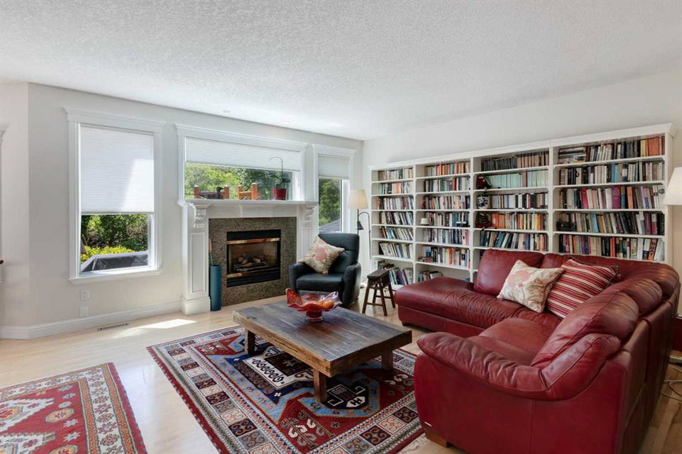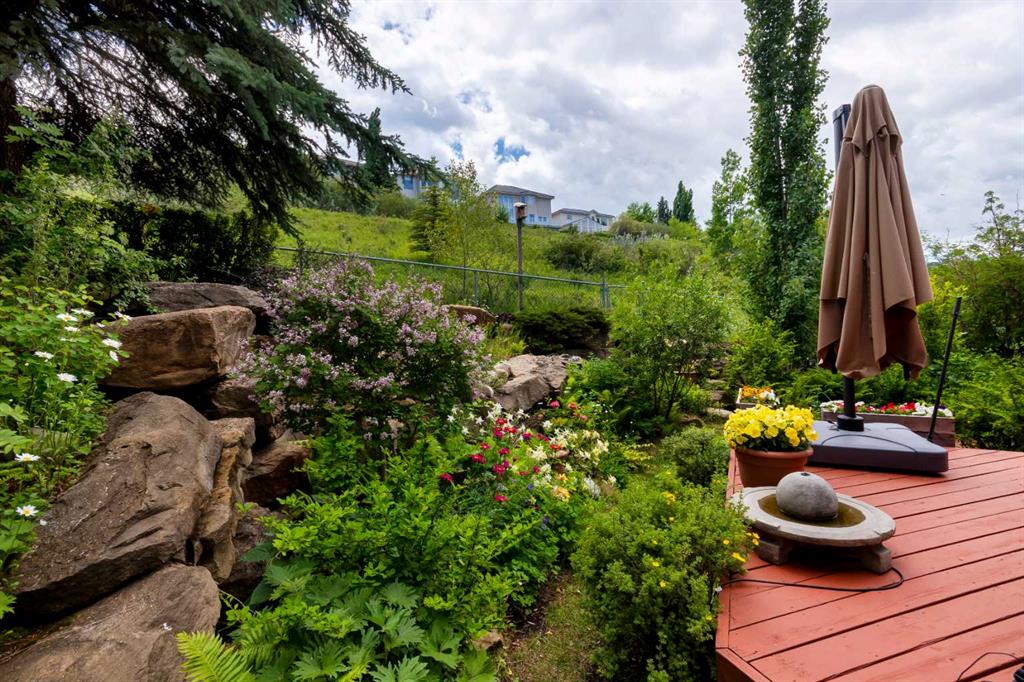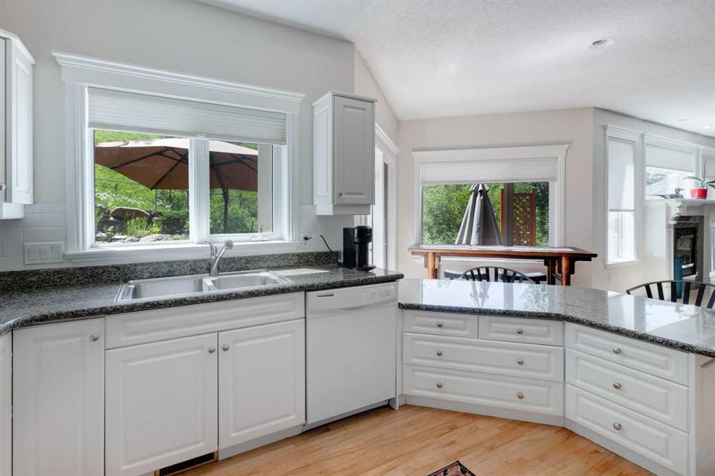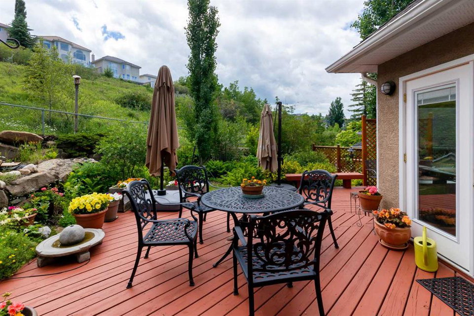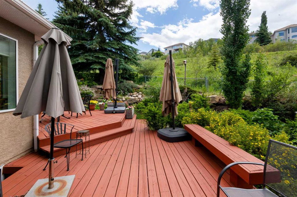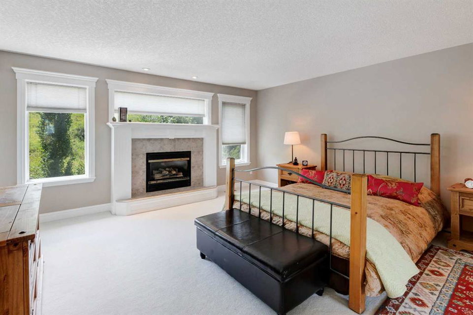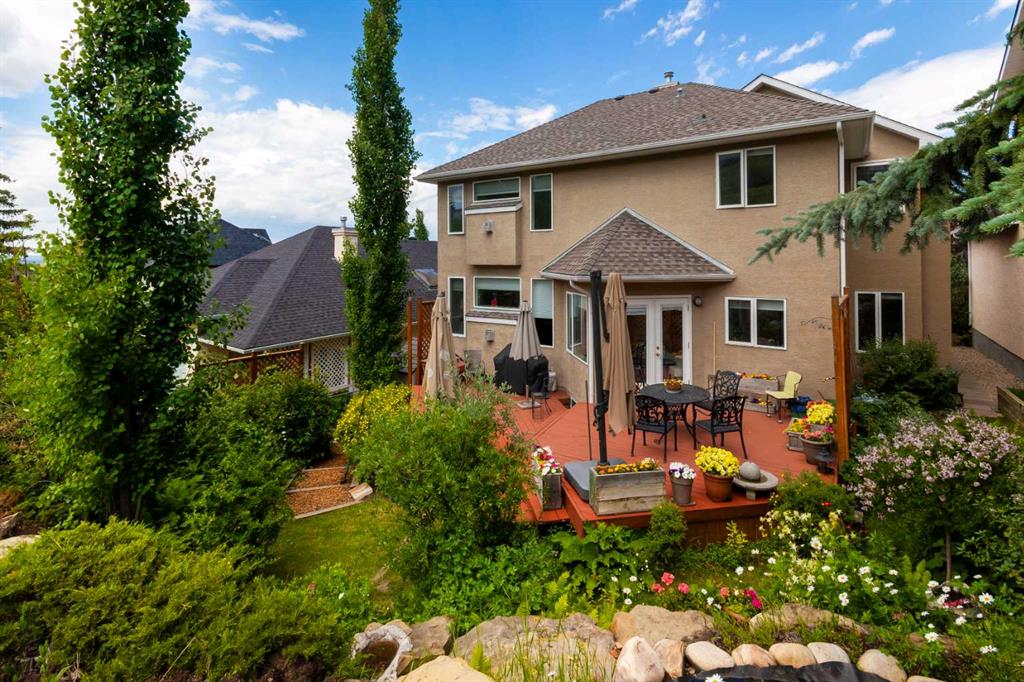 RARE OFFERING – Custom built Executive Home on Patrick View with over 3500 sq ft of developed space BACKING SOUTH onto an ENVIRONMENTAL RESERVE. This home impresses on all levels and shows pride of ownership throughout. Main floor opens to a spacious foyer with French doors into the den with wonderful street vista views, and flows through to the Great Room that exhibits oversized SOUTH facing windows and a cosy fireplace. Gourmet Kitchen features granite counters, gas stove, serving bar and a spacious nook that opens onto the SOUTH BACKYARD oasis. Main floor also features a formal dining room, a large walk-through cloak room and a 1/2 bath. Ascend the stairs to find the main bathroom, upper laundry and 4 bedrooms including a large front bedroom that could also be used as a bonus room plus a spacious primary that features its own fireplace, a well appointed ensuite and partial RIVER VIEWS across to the EAST. The fully finished basement offers significant natural light through the oversized windows and features a great layout including a large recreational room, full bathroom, two rooms that can be used as bedrooms and a third separate room with built-in cabinetry for another den or hobby room. The BACKYARD is an OASIS – the care and attention to this garden displays an abundance of foliage, water features, and tiered deck areas for QUIET RELAXING and outdoor living. Some of the upgrades include PEX plumbing (no PolyB), hardwood on the upper floor, and window glass replacement in 2021. This home is a dream come true for its new owners and is only 15 minutes to downtown and a quick exit to the mountains!
