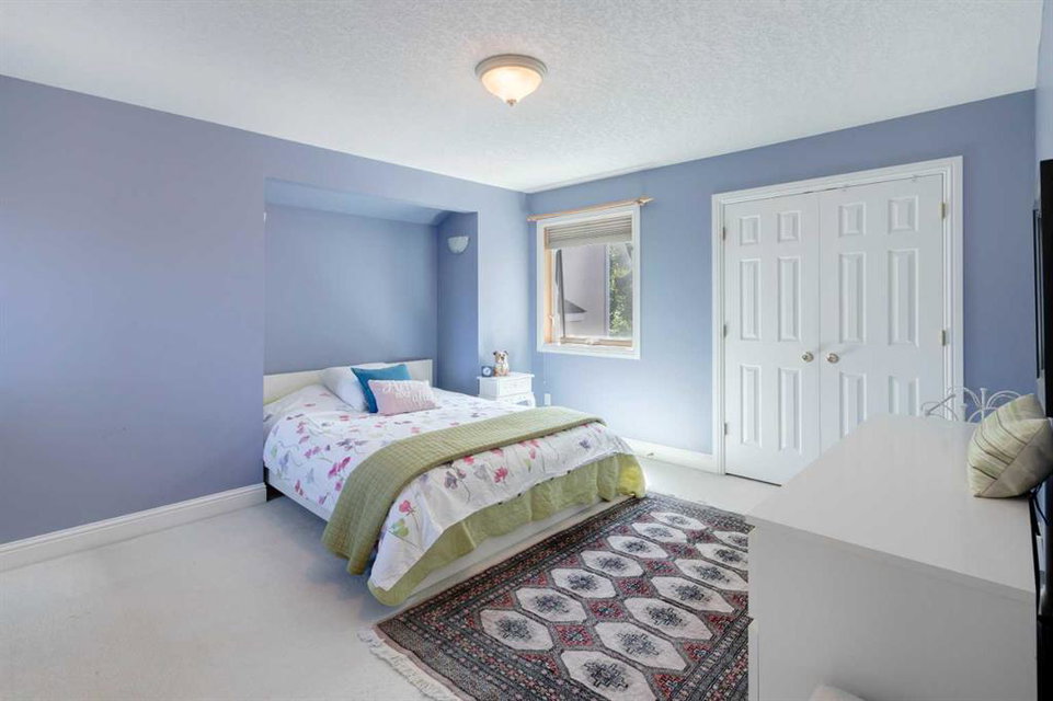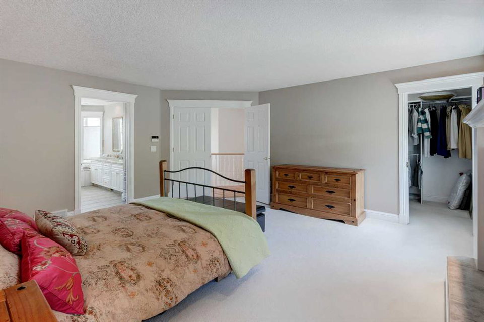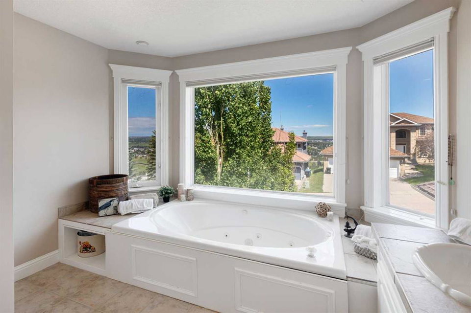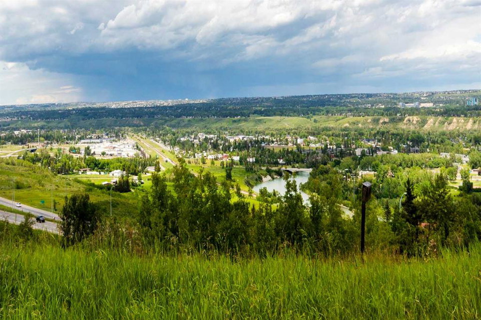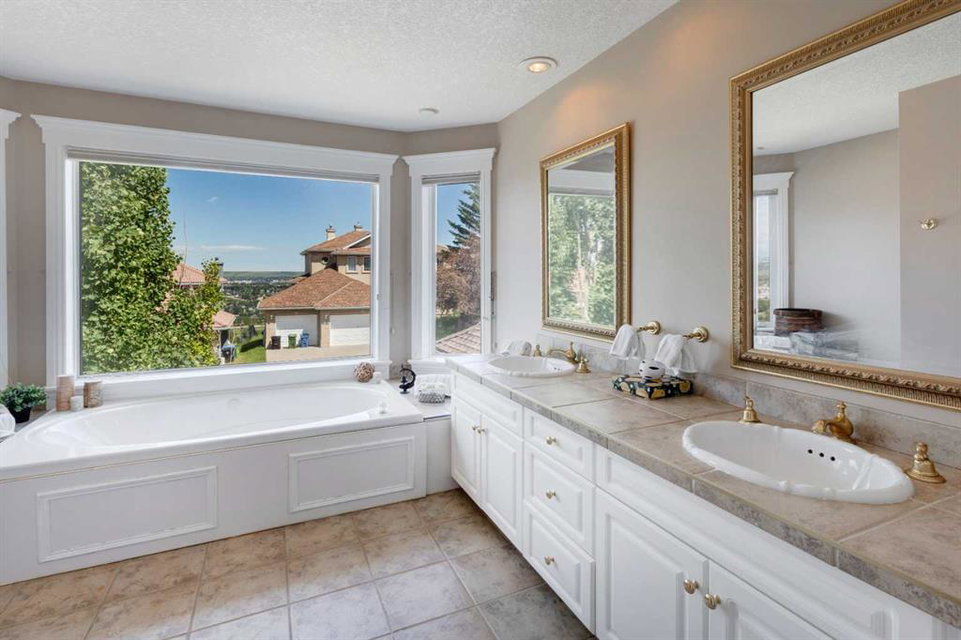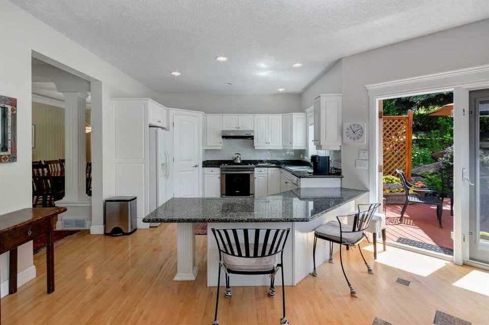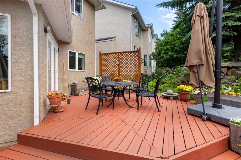 RARE OFFERING – Custom built Executive Home on Patrick View with over 3500 sq ft of developed space BACKING SOUTH onto an ENVIRONMENTAL RESERVE. This home impresses on all levels and shows pride of ownership throughout. Main floor opens to a spacious foyer with French doors into the den with wonderful street vista views, and flows through to the Great Room that exhibits oversized SOUTH facing windows and a cosy fireplace. Gourmet Kitchen features granite counters, gas stove, serving bar and a spacious nook that opens onto the SOUTH BACKYARD oasis. Main floor also features a formal dining room, a large walk-through cloak room and a 1/2 bath. Ascend the stairs to find the main bathroom, upper laundry and 4 bedrooms including a large front bedroom that could also be used as a bonus room plus a spacious primary that features its own fireplace, a well appointed ensuite and partial RIVER VIEWS across to the EAST. The fully finished basement offers significant natural light through the oversized windows and features a great layout including a large recreational room, full bathroom, two rooms that can be used as bedrooms and a third separate room with built-in cabinetry for another den or hobby room. The BACKYARD is an OASIS – the care and attention to this garden displays an abundance of foliage, water features, and tiered deck areas for QUIET RELAXING and outdoor living. Some of the upgrades include PEX plumbing (no PolyB), hardwood on the upper floor, and window glass replacement in 2021. This home is a dream come true for its new owners and is only 15 minutes to downtown and a quick exit to the mountains!